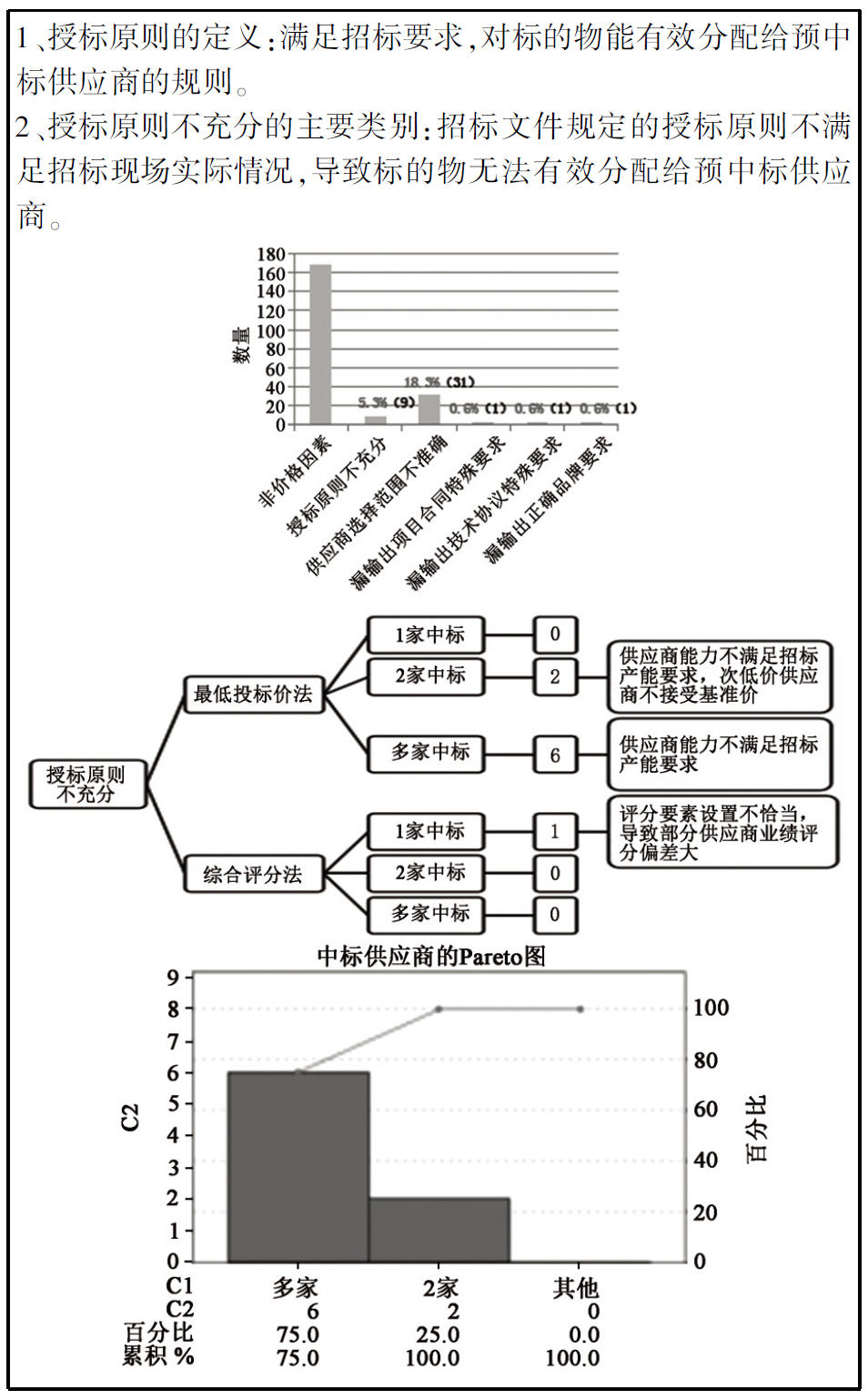 采用柱状图、柏拉图和逻辑思维导图等对测量阶段梳理出的5种失效模式进行深入研究,最终梳理出授标原则不充分和供应商信息不完整是两种非价格因素导致采购招标流标的根本原因,如图4和图5。