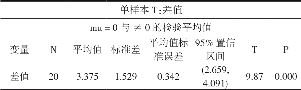 做出下线尺寸的首件设定值偏大的假设,为了判断这样的假设是否真实,有必要根据实际的生产数据对其进行假设检验。因此,随机抽取三车间第二季度的下线尺寸数据,记录在不同公差范围要求的情况下首件设定值与公差中心值之差,并分析实际设定值偏大的情况是否显著。记录的数据运用Minitab软件对差值是否等于零进行假设检验,选择单样本的T检验:原假设H0为差值为零,备择假设H1为差值不为零,检验结果如表2所示: