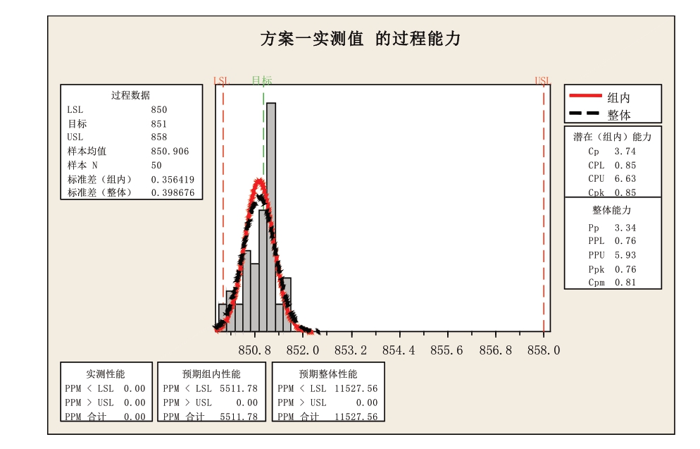 1)方案一。尺寸要求:850 mm,首件设定:851 mm,公差范围:0 mm~8 mm。运用Minitab软件对方案一进行过程能力分析,如图1所示: