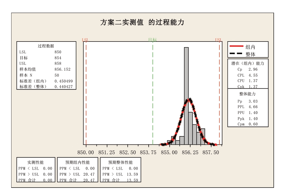 从方案一的过程能力分析图中能够比较明显地看出:所有导线尺寸虽然都合格,但Cpk=0.85<1.33,显然过程能力不足,存在质量风险,所以按照公差下限值+1 mm设定首件尺寸不符合生产质量要求,因此方案一不选。