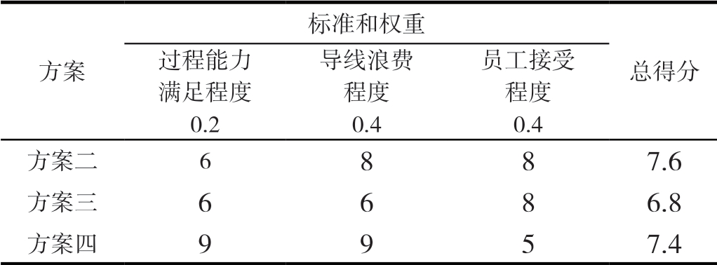 在上述四个方案中,方案一由于不满足过程能力的要求所以不予考虑,则在剩下的三个方案中进行选择,为了使方案选择更合理准确,按照过程能力满足程度、导线浪费程度、员工接受程度的标准进行方案的评价选择,具体评价如表3所示。