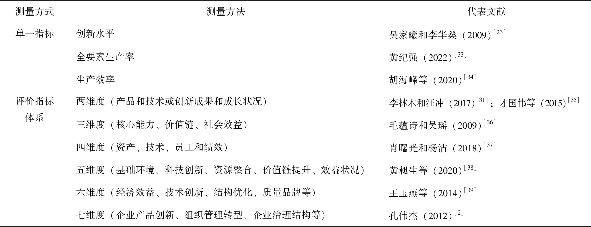 现有研究关于转型升级的衡量可以分为以结果为导向的单一指标和指标体系(见表1)。有学者认为通过财务报表中体现出来的企业发展状况可以看出转型升级的效果[30],但随着转型升级内容的丰富,越来越多的学者通过构建评价指标体系对企业转型升级进行测量。在指标选取上,学者们根据对转型升级内涵理解的不同选择了不同的维度。一些学者对企业转型升级能力和企业转型升级绩效进行了测度[1]。如以研发投入强度(包括资金投入和人员投入)衡量转型升级能力[31],以托宾Q值、净资产收益率等盈利指标来衡量财务绩效[32],以研发产出和产品市场份额变化衡量非财务绩效[1],并将财务和非财务绩效相结合来衡量企业转型升级绩效。