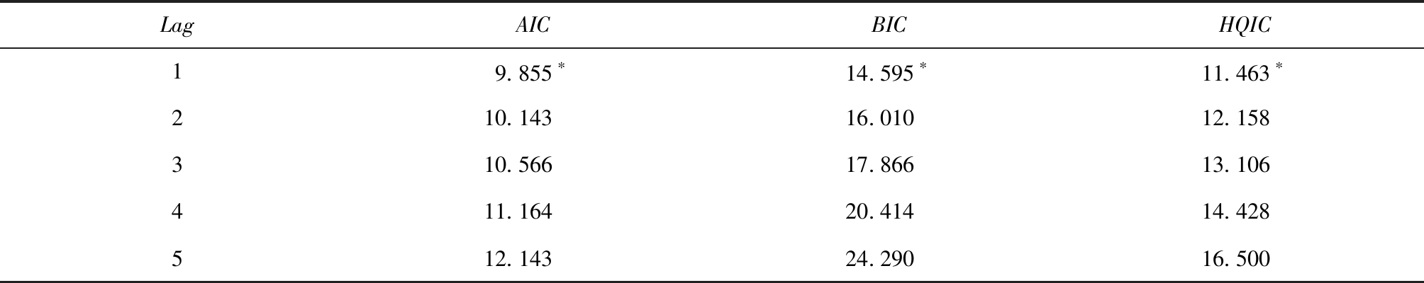 在变量平稳的基础上,可以直接进行最佳滞后阶数选择。在PVAR模型中,变量滞后阶数的选择关系到能否得到有效的估计结果。本文根据赤池信息准则(AIC)、贝叶斯信息准则(BIC)和汉南-奎因信息准则(HQIC)选择模型的最优滞后阶数。通常认为各准则的最小值为该准则选择的最优滞后阶数,由表4可知,当最佳滞后阶数(Lag)是1阶时,PVAR模型将具有较好的估计结果。