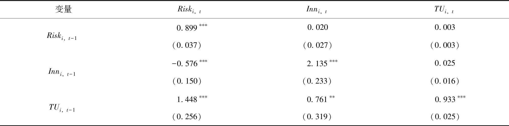 本文通过构建PVAR模型,分析制造业企业风险承担、创新意愿与转型升级之间的动态关系。在面板向量自回归模型中,通过将所有变量转化为内生变量,探讨变量之间的交互关系,并考虑所有变量滞后项的影响[60],既继承向量自回归(VAR)模型的优势,又能够克服VAR模型对时间跨度的要求。