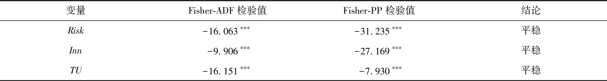 平稳的变量在长期具有均值回复的性质,但非平稳的变量会将任何冲击都无限放大,从而使传统的检验都失效。因此,有必要先对变量的平稳性进行检验。本文采用费雪式(Fisher-ADF和Fisher-PP)单位根检验方法对原数据进行检验。结果如表3所示,风险承担(Risk)、创新意愿(Inn)与企业转型升级程度(TU)的原数据序列都是平稳的,因而可以进行PVAR模型估计。