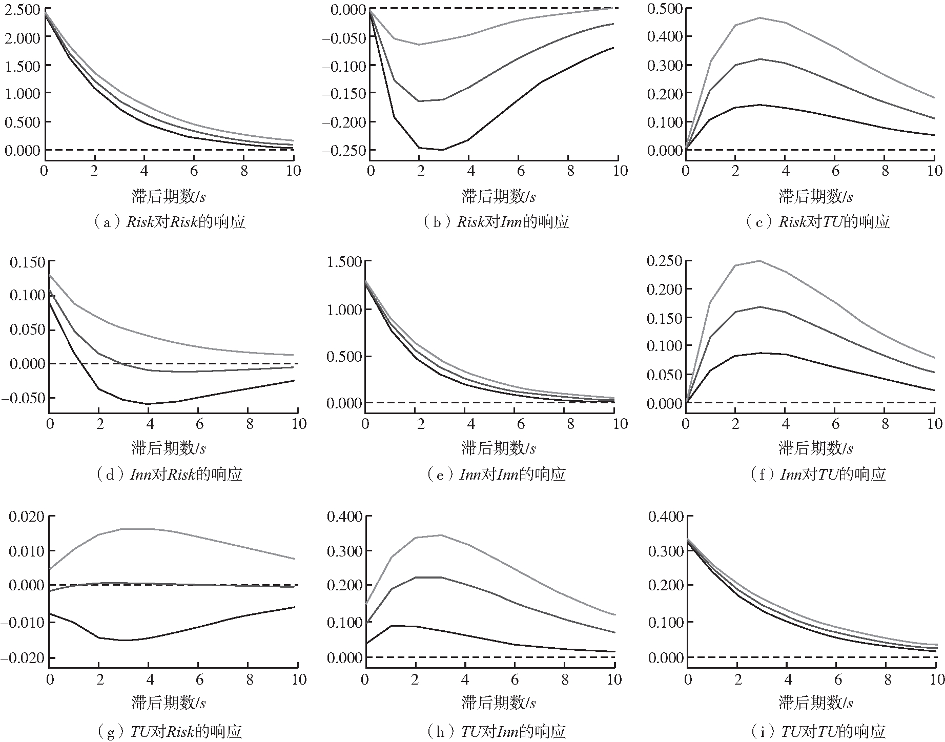 由表6可知,在1%的显著性水平下,企业创新意愿是风险承担的格兰杰原因;在1%的显著性水平下,转型升级是风险承担的格兰杰原因;在5%的显著性水平下,转型升级是创新意愿的格兰杰原因。因此,风险承担、创新意愿与转型升级之间存在着相互作用关系。进一步地,本文将通过脉冲响应函数对风险承担、创新意愿与转型升级之间的互动关系做深入分析。