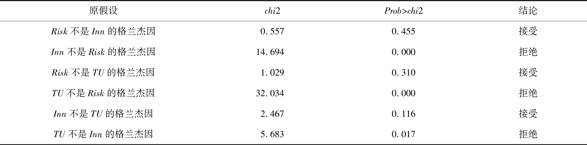 为深入研究风险承担、创新意愿和转型升级三者之间是否具有稳定的因果关系,本文进一步对三者之间的关系进行格兰杰因果检验,结果如表6所示。