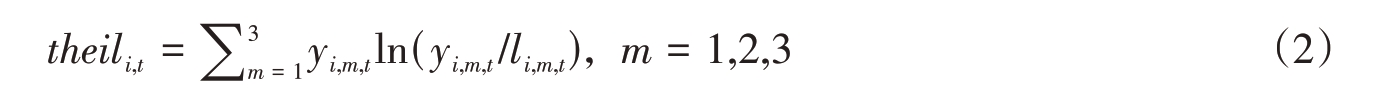 其中,yi,m,t表示i地区m产业在t时期占地区生产总值的比重,li,m,t表示i地区m产业t时期从业人员占总就业人员的比重。产业结构泰尔指数反映的是三大产业产值结构与就业结构之间的偏离程度,若该指数为0,说明产业结构处于均衡水平;若不为0,说明产业结构偏离均衡状态,产业结构不合理。