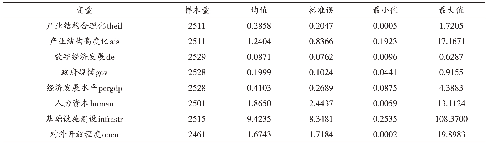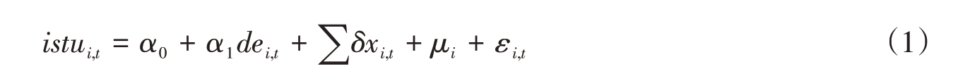 在(1)式中,istui,t为i地区t时期产业结构转型升级水平;dei,t表示i地区t时期的数字经济发展水平;xi,t为一系列控制变量,包括政府规模、经济发展水平、人力资本、基础设施建设以及对外开放程度等,很大程度上避免了因遗漏变量带来的估计偏误;μi为个体固定效应;εi,t为误差项。