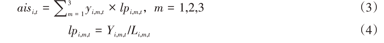 其中,lpi,m,t表示i地区m产业在t时期的劳动生产率;Yi,m,t表示i地区m产业t时期的增加值,Li,m,t表示i地区第m产业t时期的就业人员,同时,本文采用均值化方法对产业结构高度化进行了无量纲化处理。