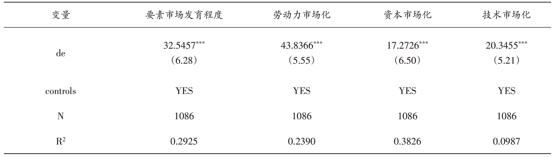 上述一系列回归结果稳健地证实了数字经济能显著促进产业结构合理化,而对产业结构高度化的促进作用尚不显著的结论。此处,本文还需对数字经济影响产业结构转型升级的内部机制进行检验,进一步明确数字经济能否通过有效推动要素市场化改革,带动产业结构转型升级。