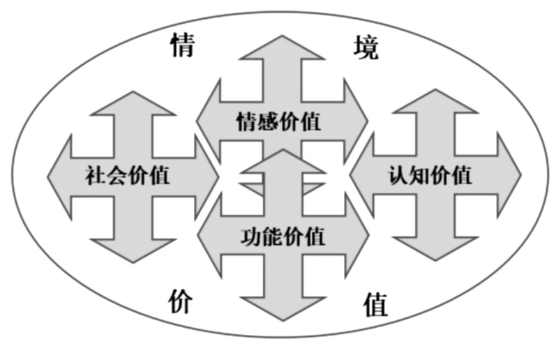 1991年,希斯(Sheth)、纽曼(Newman)和格罗斯(Gross)提出产品的五种消费价值:功能价值、社会价值、情感价值、认知价值和条件价值。[3]这五种价值的意涵和相互间的关系,随着市场关系的变迁发生着变化。在传统的消费价值共创理念下,五种价值呈现单向循环关系,即以功能价值为基础价值,消费主体在对功能价值判断的基础上,进一步考量其对自身社会关系的构建,进而满足何种情感,从而期待其提高自身认知体系,而这一切受条件价值影响,条件价值具备,其单循环关系生效启动,否则处于虚拟关系状态。在服务生态系统价值共创理念下,条件价值转化为情境价值——融合了社会情境价值(value-in-social-context)和文化情境价值(value-in-cultural-context),五种价值呈现多节点关联,并共处于情境价值中,情境价值既是其他价值的条件、环境,又受其他价值影响变化,任何一个价值均可成为培养或改变其他价值的基础。基于此,本研究从功能价值、社会价值、情感价值和认知价值四个维度探讨实体书店共创现状,而将情境价值融入这四个维度之中进行考察(见图1、图2)。