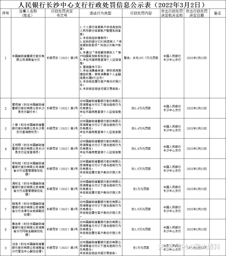 3月2日,中国人民银行长沙中心支行发布最新的处罚信息,《公示》显示:邮储银行湖南省分行因9项违规被罚187.7万,同时8名相关责任人一同被处罚。违法行为类型为: