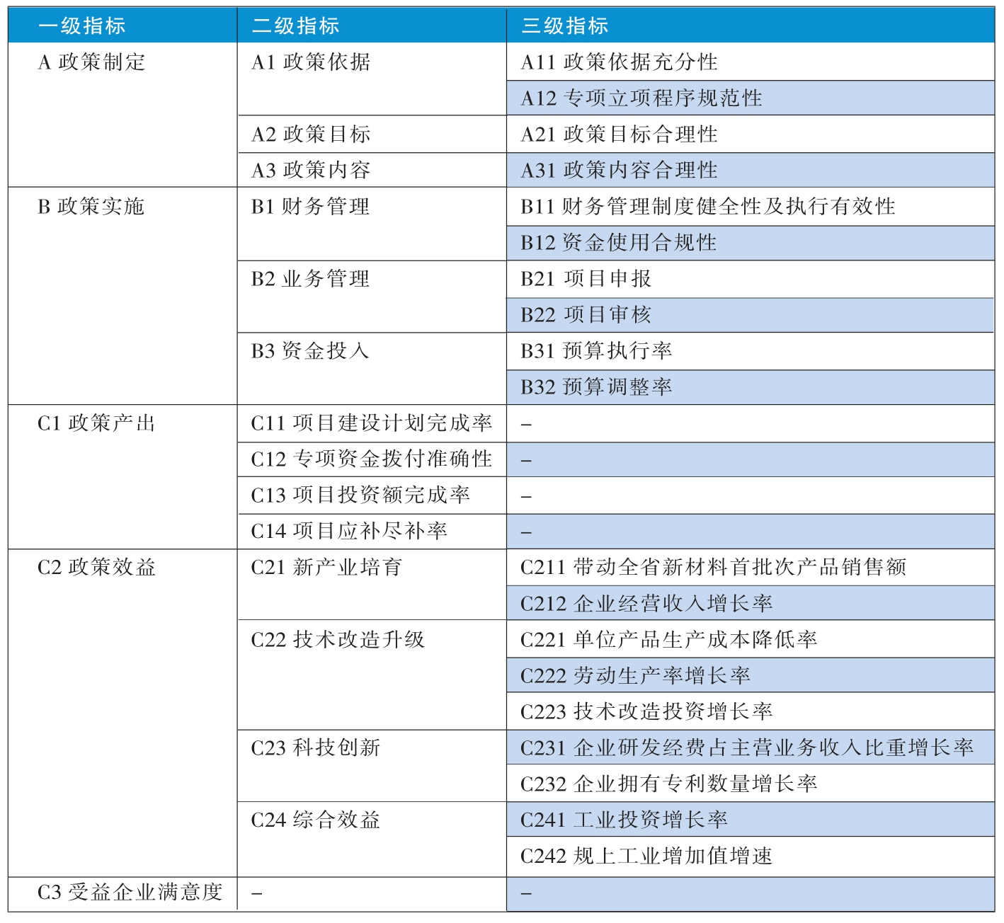 评价指标体系的设计依据 “政策制定-政策实施-政策产出-政策效果” 的基本逻辑路径。 其中,政策制定类指标主要针对政策制定的依据、政策目标的合理性以及政策内容的合理性进行设计。政策实施类指标分别针对业务管理、财务管理以及资金投入情况进行指标设计。 政策产出指标主要从项目实施方式出发,考察奖补项目完成情况及项目建设完成情况,确保政策产出符合预期、计划真实可行。 政策效益指标主要从政策重点扶持的三个方向出发, 分析政策实施之后重点扶持方向效益的达成情况, 同时考察政策实施后对工业的综合效益。