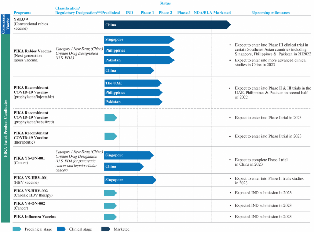 公司有包括皮卡狂犬病疫苗、皮卡YS-ON-001及皮卡YS-HBV-001;及4种针对COVID-19、乙型肝炎病毒(HBV)、流感及具有巨大医疗需求的癌症的临床前阶段在研产品。