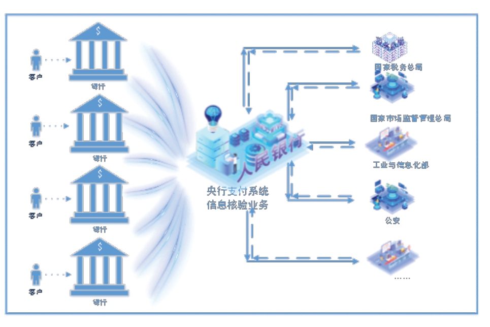 3. 信息业务。业务范围:企业信息联网核查系统等。发展策略:发挥部委端信息优势,推动业务场景扩展,支持商业银行进一步增强客户识别和风险管控的能力,通过企业工商登记信息、纳税信息以及法人代表身份信息、手机号码信息的联合交叉比对分析,帮助商业银行在企业开户等业务场景中,研判合规性与风险水平;探索发挥央行金融基础设施的信息集约优势,作为商业银行信息核心节点枢纽,加强与相关部委类信息源的交互与合作,以满足商业银行向有权机关申请行政类数据的需求;发挥数据优势,开展风险防控产品建设,帮助监管部门、服务对象提升风险防控能力。信息核验业务流程如图1所示。