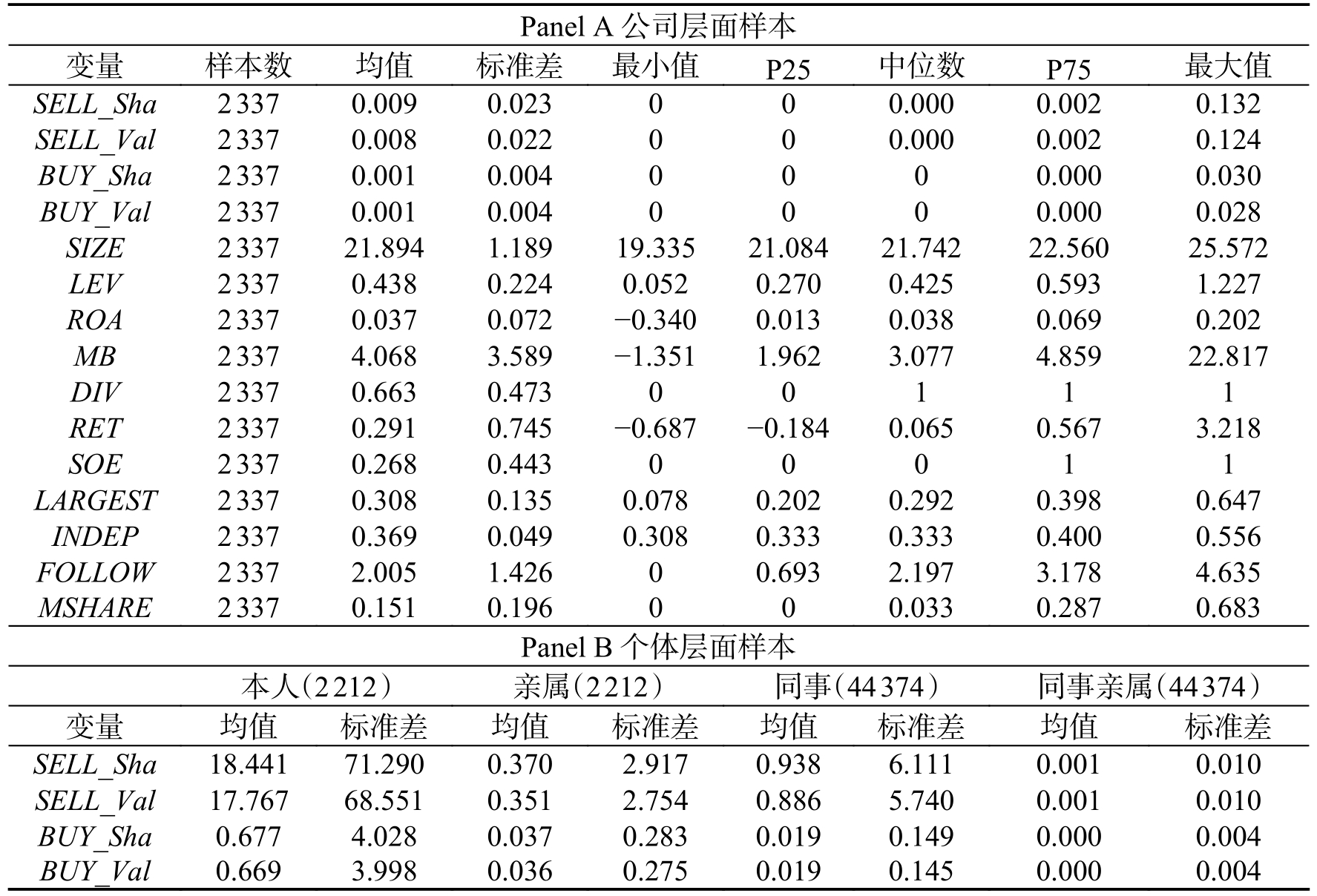 表2 Panel A为公司层面主要变量的描述性统计,从中可以发现,在本文的样本区间内,高管及其社会关系平均每年卖出股票数量202.56万股,约占公司流通股数的0.86%,卖出股票金额3 076.19万元,约占公司流通市值的0.82%,同时平均每年买入股票数量30.69万股,约占公司流通股数的0.10%,买入股票金额392.48万元,约占公司流通市值的0.09%,结合高管持股比例平均约为15.10%,可见公司高管及其社会关系每年减持较为频繁,并且减持数量和金额明显大于增持的情况;高管及其社会关系每年卖出和买入股票的数量和金额占比的标准差大于均值,75分位数小于均值,可见公司高管及其社会关系每年减持和增持的波动较大,并且呈右偏。表2 Panel B为个体层面主要变量的描述性统计,从中可以发现,被罚高管及其社会关系的减持数量和金额都明显大于增持的情况;并且不管是卖出还是买入本公司股票,被罚高管的交易数量和金额明显大于其亲属、同事及其亲属的交易情况。