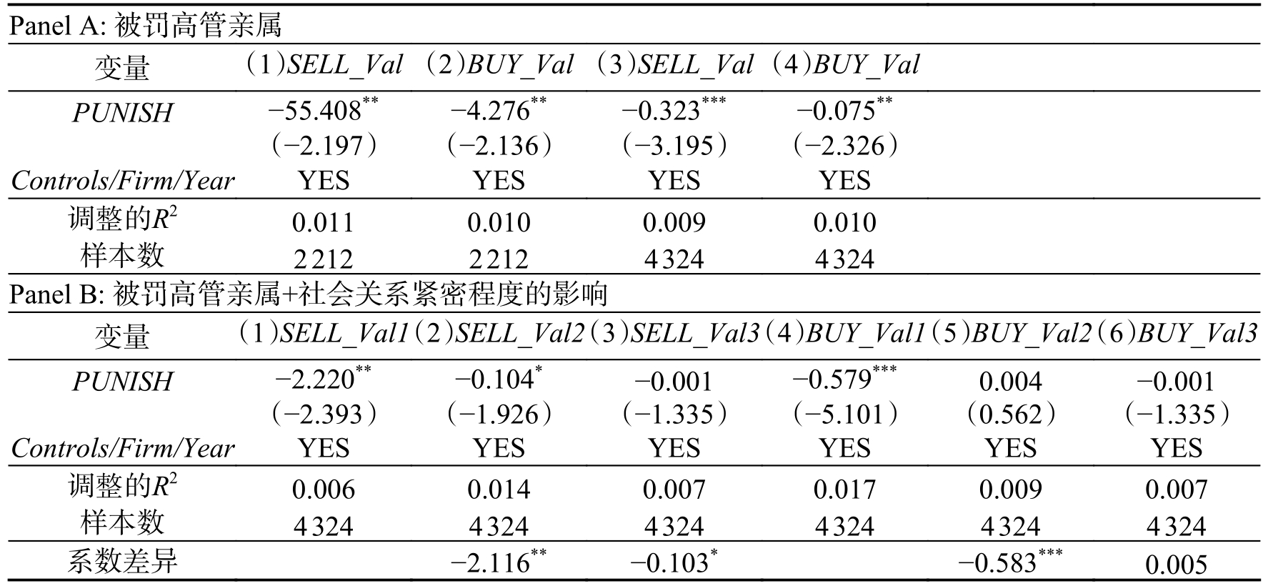 其中,被解释变量TRADE内部人交易,方向上分别从卖出股票和买入股票衡量,维度上分别从交易数量和交易金额衡量,由此得到SELL_Sha内部人卖出数量、SELL_Val内部人卖出金额、BUY_Sha内部人买入数量、BUY_Val内部人买入金额,并进一步在主体上分别对应被罚高管本人、被罚高管(未违规)亲属、被罚高管(未违规)同事、被罚高管(未违规)同事亲属。解释变量PUNISH监管处罚,对于违规高管,在其被罚之后年度(不包括被罚当年)取1,否则取0;对于违规高管的社会关系,在其关联的违规高管被罚之后年度(不包括被罚当年)取1,否则取0。其他变量定义见表1。模型中已经控制了公司固定效应和年度固定效应。为了控制极端值的影响,对所有连续变量按照上下1%的标准进行缩尾处理。