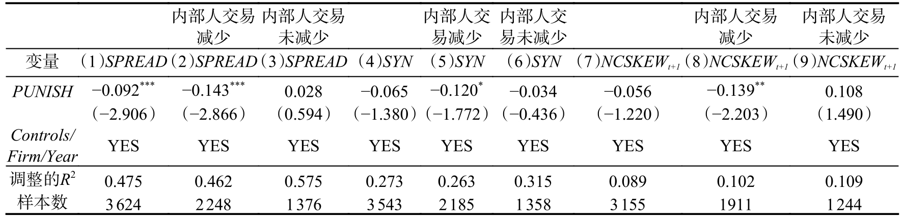 本文从公司层面检验监管处罚对股票定价效率的影响。具体地,本文采用买卖价差衡量股票交易成本、股价同步性衡量股票信息含量、股价崩盘风险衡量股票价格负面冲击,并根据监管处罚后内部人交易是否减少分组考察监管处罚对市场效率的影响。本文借鉴Corwin和Schultz(2012)提出的方法计算买卖价差指标SPREAD,借鉴Gul等(2010)提出的方法计算股价同步性指标SYN,借鉴Kim等(2011)提出的方法计算股价崩盘风险指标NCSKEW。回归结果如表8所示,可以发现监管处罚能够明显减少买卖价差、降低股价同步性、缓解股价崩盘风险,且这一效果只体现在监管处罚导致内部人交易减少的情况下。