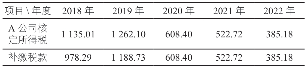 2018—2022五年间,A公司由于三年的连续亏损,五年缴纳的所得税费只有230.09万元。税务机关对A公司实施特别纳税调整后,重新核定了A公司的收入和利润。最终,A公司需要向税务机关补缴税款3 683.31万元,相当于以前缴纳税款的16倍。表2、3为A公司2018—2022年所得税情况