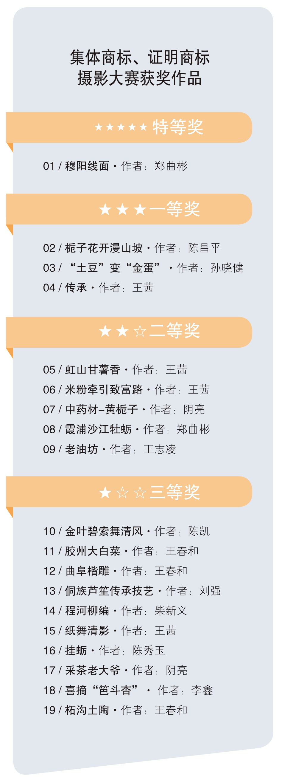 本次大赛,经初评、终评,评选,在1100多幅(组)作品中选出特等奖1名、 一等奖3名、二等奖5名、三等奖10名,并将获奖作品和入选作品集结成册,希望通过对获奖作品的宣传,让地理标志商标产品从产品到产业再到品牌,在传承传统文化、有效扩大消费、提振市场信心、推动区域特色经济发展、推进乡村振兴方面焕发新的生机。