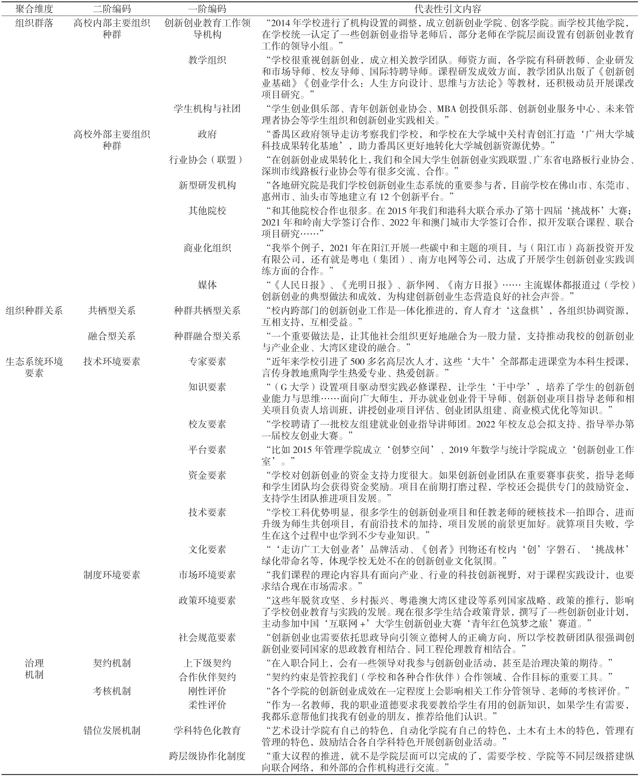 表2 G 大学创新创业生态系统治理体系构建要素与机制的编码结果