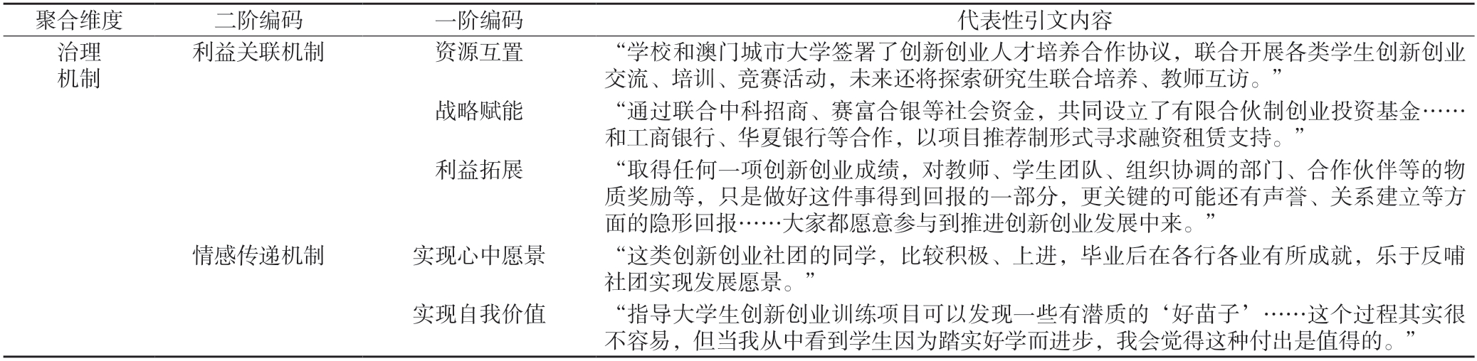 第四,利益关联机制。利益关联机制是指校内、校外组织依托资源互置、战略赋能和利益拓展等思路进行关系治理。其一,资源互置能提高组织间资源的价值最大化利用。例如G 大学与香港岭南大学联合通过“创新创业线上工坊”“寒暑假创新创业实训营”等共享联合课程,一位正承建省级创业课程建设项目的教师评价道:“跨境合作创新创业合作,对学校来说是能借助岭大的国际合作资源和国际师资,而岭大可以借助学校深厚的产业优势、平台优势,为该校学生创新创业成果落地大湾区提供支撑”。其二,战略赋能是推进战略合作伙伴结构升级,发挥协同效应、价值共创的一种战略谋划。G大学主要和科研院所、投资机构、中介机构、企业等外部组织合作,随着外部制度规范性的提升,如金融信贷体制、交易政策等不断健全,学校升级与外部组织的战略合作,构建“研究院投资公司+学院+创业团队”“技术转让中心+公司+学生团队”等多向赋能的战略合作模式,满足各方服务产业升级、增加经济效益和培育优秀人才等的利益追求与行动逻辑。其三,利益拓展是指两个以上的组织个体寻找到第三场域的共同利益交汇点。具体而言,企业与学校推进创新创业合作,双方除了达成获取经济利益、人力资本和科技资源等实质性合作成果,往往还产生难以直接定义与衡量的情感建设、社会声誉等其他利益点。一位主管创新创业工作的受访者强调:“企业、学校通过教育活动冠名、合作基地挂牌、设置校企专项奖学金等各类形式,可以优化企业和学校双方的社会声誉,进而间接地扩大在教育领域、商业领域的影响力,最终提高组织效益长期经营好情感关系,追求的是长期绩效回报”。同理,学生机构与社团、教学组织等积极参与创新创业活动,部分学生骨干树立为朋辈榜样,教师骨干树立为名师典范,均是绩效回报以外的利益拓展。