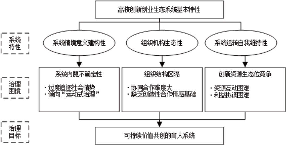 Maritz等[13]、Mckeon[14]指出,归根结底,高校创新创业生态系统是培育创新人才与释放创新潜力过程中诸多因素关联交织、利益相关者紧密互动的社会生态系统。相较于一般的生态系统,其本质既需要反映系统生态化,还要体现创新人才培育特质、经济活动特质[15],所呈现出的系统情境意义建构性、组织机构生态性、系统运转自我维持性等特性,使得系统治理面临复杂挑战。较为突出地反映在如下三大方面: