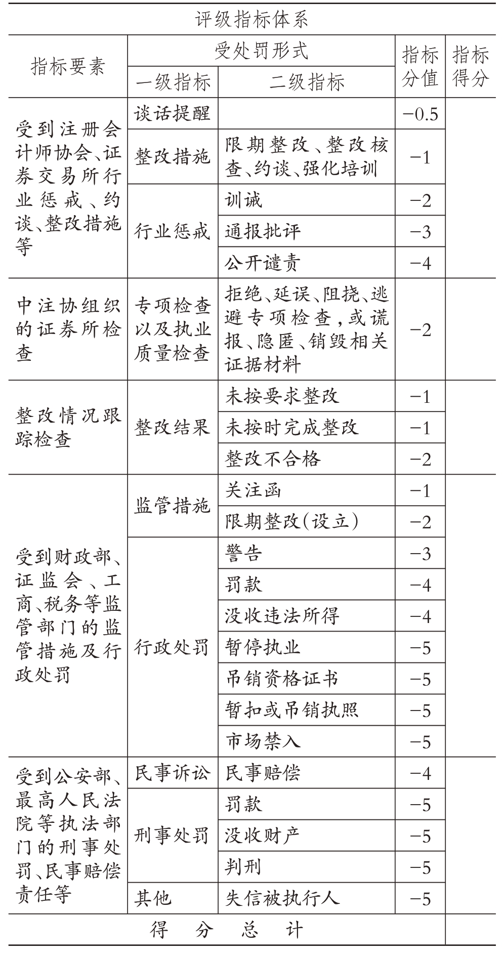 表3 中:①违法违规失信的受处罚主体包括会计师事务所及所内注册会计师。②为增强诚信评级的客观性,指标中未列入会计师事务所及注册会计师的优良诚信档案记录,如被表彰、参与公益事业、社会任职等情况。③同一部门对同一会计师事务所相同违法违规事项的处理,如涉及多种处分或处罚,按照最高处分或处罚扣分;不同部门对同一会计师事务所相同违法违规的处理,不累计扣分,按最高处分或处罚扣分;对同一会计师事务所同一违法违规事项的处理既涉及会计师事务所又涉及注册会计师的,不累计扣分,按最高处分与处罚扣分,但同时要记入注册会计师个人诚信评级系统。④指标信息来源为会计师事务所诚信档案。