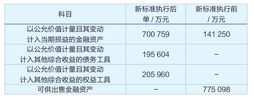 2019 年第一季度财务披露显示,在新标准的影响下,金融资产科目发生变化,具体如表1 所示。