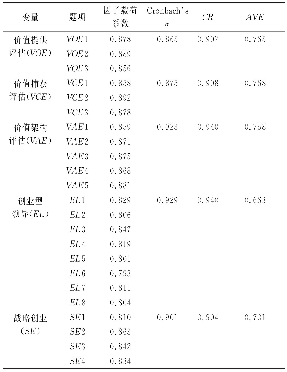 (1)商业模式评估 借鉴SCHRAUDER等[16]的测量量表,商业模式评估(BME)由价值提供评估(VOE)、价值捕获评估(VCE)、价值架构评估(VAE)3个维度组成。其中,VOE包括3个题项,如“我们有意识地评估高程度替代的客户问题和需求”等;VCE包括3个题项,如“所有业务资源需求”等;VAE包括5个题项,如“销售和分销渠道”等。