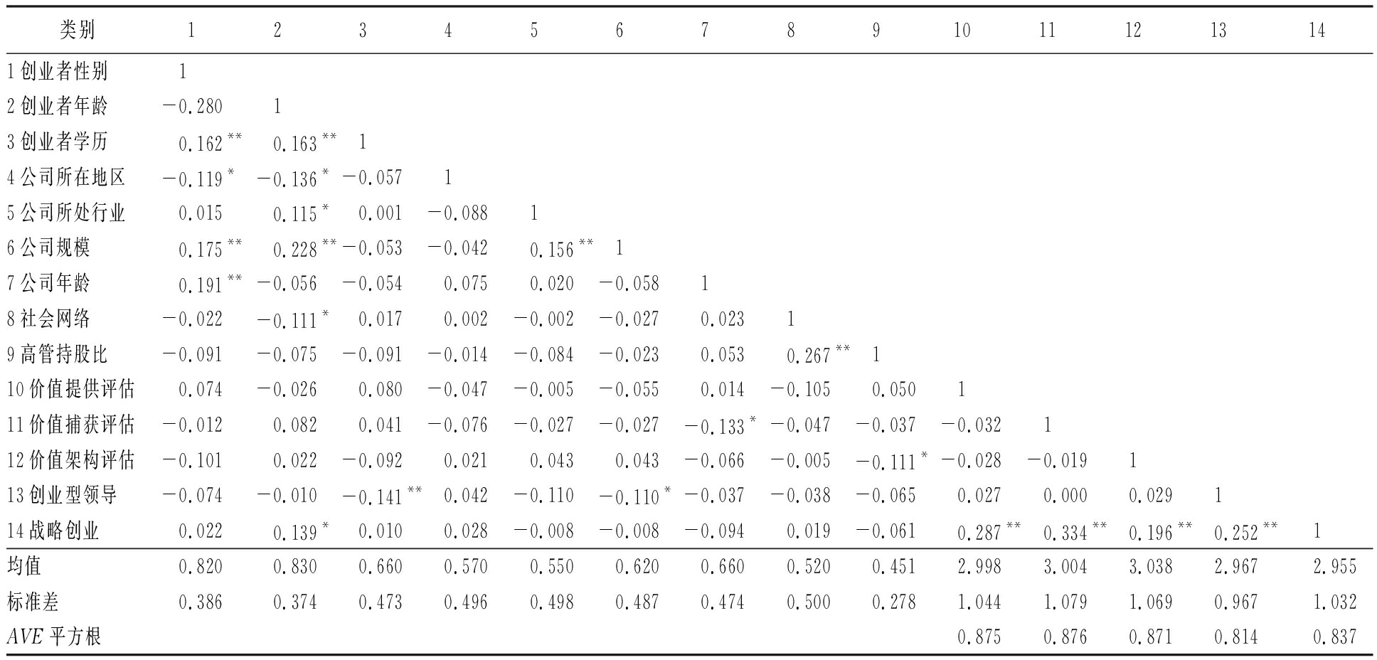 变量的描述性统计和相关性分析见表2。由表2可知,价值提供评估、价值捕获评估、价值架构评估、创业型领导与战略创业之间存在显著的正相关关系,这为理论假设提供了初步支持;且每个变量的AVE 平方根都比该行和该列的相关系数大,区分效度得到验证。