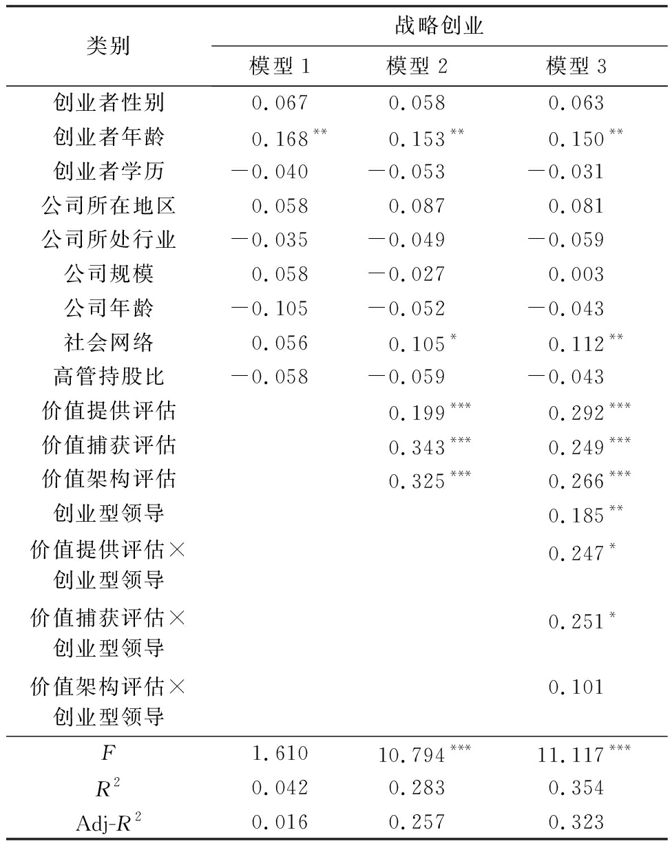 本研究改变回归分析方法,采用极大似然估计方法得到的稳健性分析结果见表4。由表4模型3可知,价值提供评估(β1=0.281,p<0.001)、价值捕获评估(β2=0.241,p<0.001)和价值架构评估(β3=0.272,p<0.001)对战略创业的影响显著;交乘项中,创业型领导对价值提供评估和战略创业的关系(β4=0.247,p<0.05)、价值捕获评估和战略创业的关系(β5=0.263,p<0.05)的调节效应显著,对价值架构评估与战略创业关系的调节效应(β6=0.089,p=0.477)不显著。回归方法的改变不影响模型的关系,本研究的结论具有稳健性。