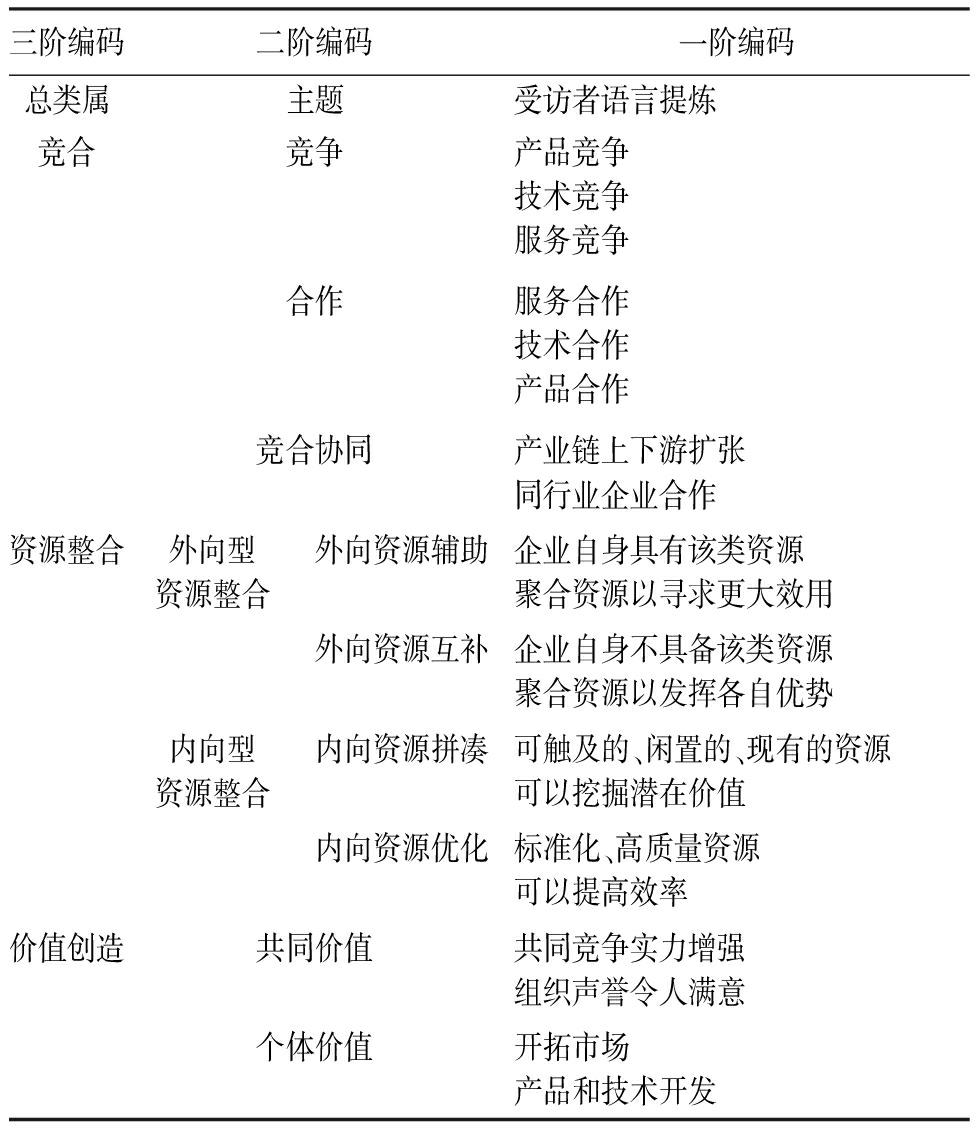 价值网成员间的竞合被认为是价值创造的关键。目前研究主要基于资源、知识、企业能力和组织学习等视角,探讨企业竞合战略与价值创造的关系。基于资源视角,学者们认为,企业通过实施竞合战略不仅培育自身核心资源,还整合利益相关者的互补资源以创造更高价值[3]。基于知识视角,已有研究认为,竞合战略有助于企业基于彼此的知识库进行知识传递与知识创造,从而获得更大的价值[4]。还有一些研究基于企业能力视角指出,企业采取竞合战略可以利用共享的能力,如产品研发能力、市场变化应对能力等,以增加技术开发和产品创新的价值创造[5]。基于组织学习视角的研究认为,竞合战略有助于创造新的组织知识,并对知识动态运用实现价值创造[6]。与成熟企业相比,数字创业企业始终受到资源匮乏的限制,尤其需要进行有效的资源整合,并将其转化为竞争优势,创造出更多的价值[2]。因此,资源视角有助于深入揭示竞合战略与数字创业企业价值创造的关系。然而,目前尚无学者探索数字创业企业竞合战略如何整合资源以创造价值的过程和内在机理。综上,立足于现实与理论的需要,本研究以数字创业企业为研究对象,以资源整合为关键路径,探索竞合战略对价值创造的作用机理。