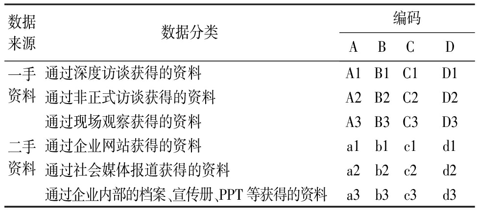 本研究使用多种来源的资料探究研究问题有利于构成“证据三角”(见表3),以提高论证的信效度[27]。除正式访谈之外,调研团队还通过非正式访谈、现场观察和二手数据等途径收集数据形成“证据三角”验证,从而提升研究的信效度。在深度访谈后,团队成员会自由发挥地向受访者提出一些不受已有观念约束的问题,以加强对受访者及企业运作的了解。研究团队通过现场观察的方式获取更多的信息和见解,如参观工作室、管理部门、产品展厅等,实地感受其具体的运作流程。同时,团队成员还通过各种渠道收集案例企业的二手资料,如企业官网资料、书籍、文献、报纸及网上报道等。通过上述方式,对受访者回答内容的真实性进行再次验证。