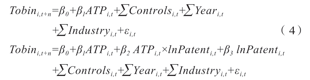 考虑到反收购条款与企业创新产出对企业价值的影响可能存在时滞性,因此本文研究反收购条款与企业创新对未来3期企业价值的影响,即n=1,2,3。