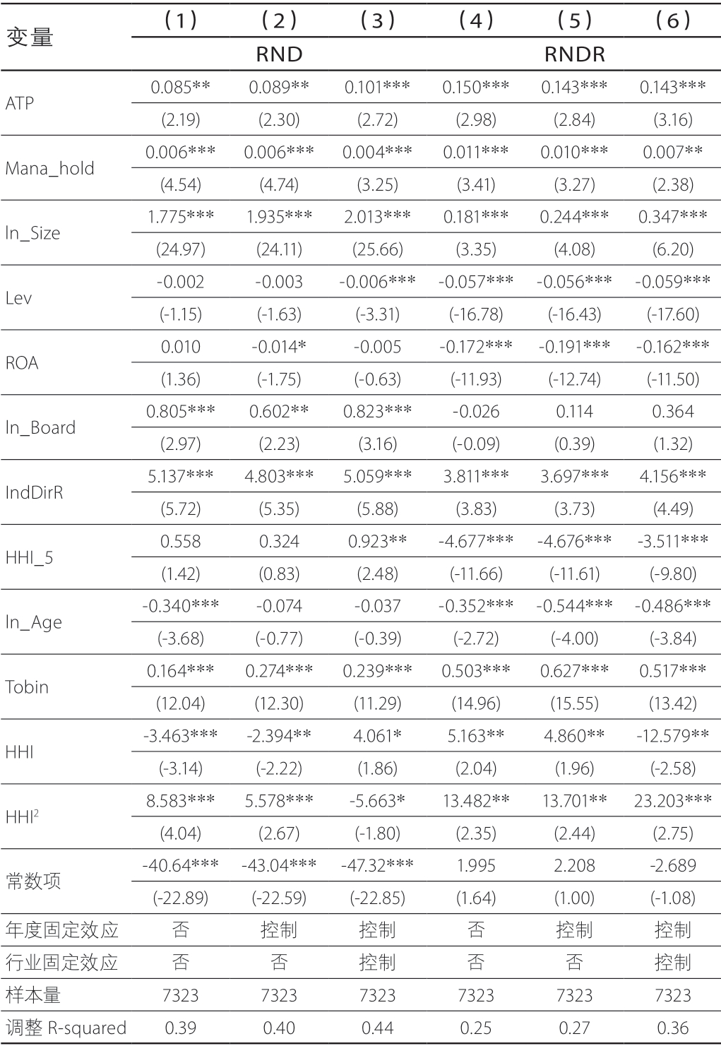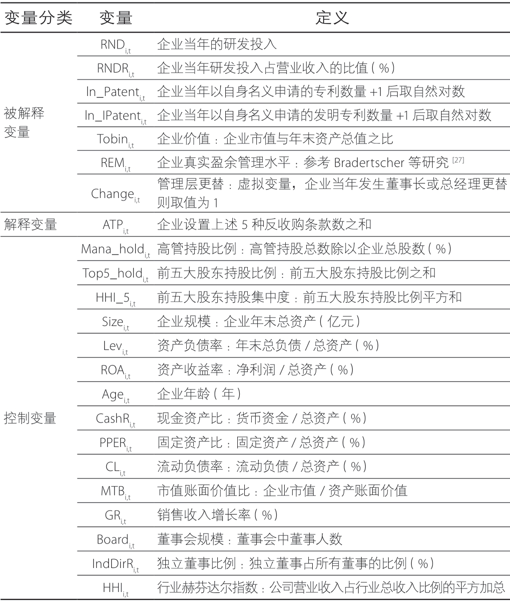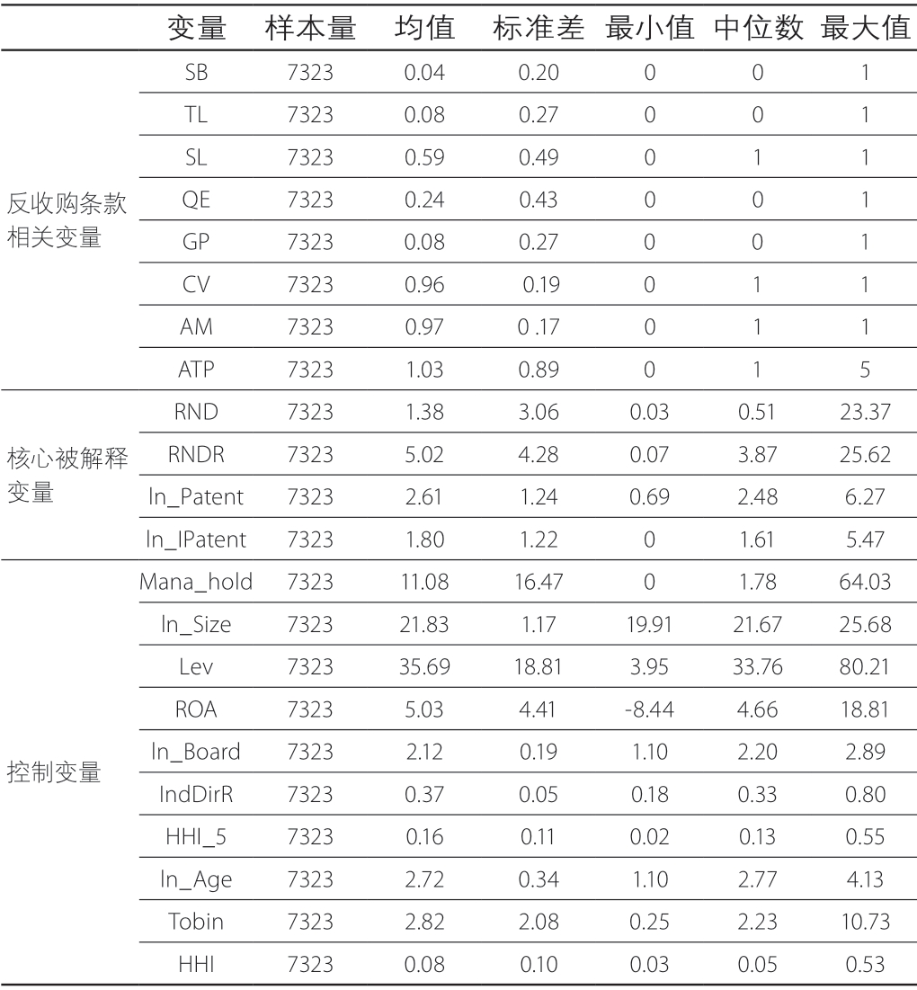 参考Chemmanur等,[6]在反收购条款与研发创新的研究中,本文选取的控制变量有:高管持股比例(Mana_hold)、企业规模(ln_Size)、资产负债率(Lev)、资产收益率(ROA)、董事会规模(ln_Board)、独立董事比例(IndDirR)、前五大股东持股集中度(HHI_5)、企业年龄(ln_Age)、所处行业赫芬达尔指数(HHI)及其平方项。