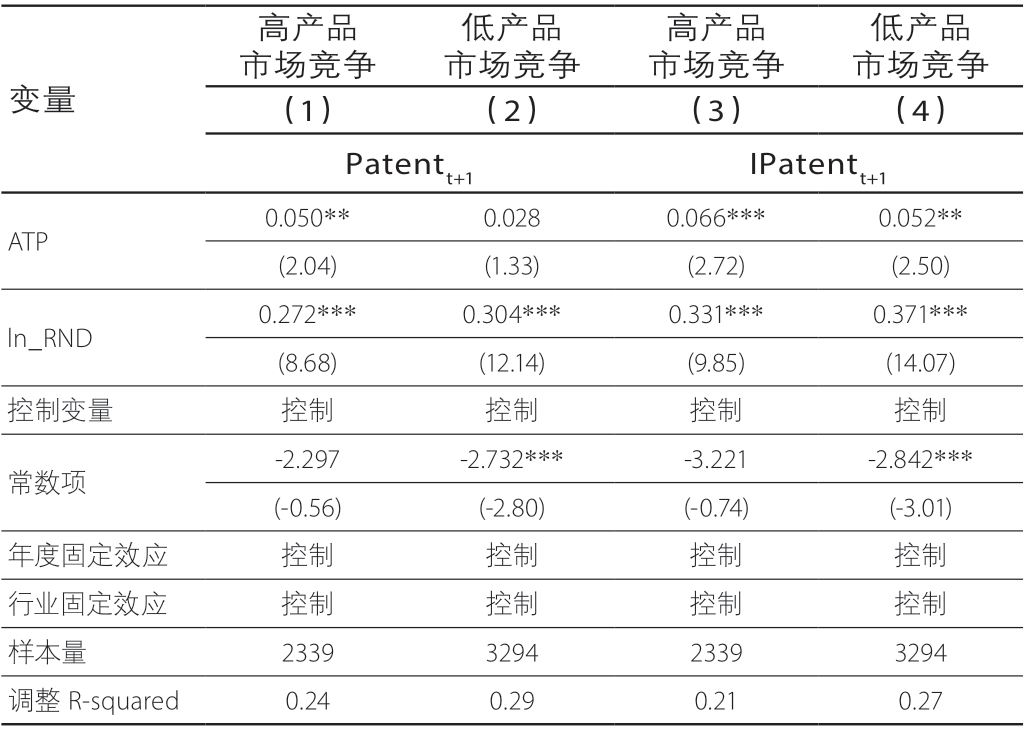 激烈的产品市场竞争增加了公司在行业中保持竞争优势及创造短期盈利以满足资本市场投资者的双重压力,[37]进而加重了管理层的短视行为。管理层倾向于将资源投入营销和扩大生产规模这类能够在短期内带来盈利的经营活动中,以迎合市场投资者的对企业业绩增长的预期。此时,由于反收购条款能够为管理层提供保护,使其免受市场压力并且专注于创新活动,那么当企业在产品市场中面临更激烈的竞争时,这种保护作用会更加重要。因此,本文参考Haushalter等的研究方法,[38]采用赫芬达尔指数(HHI)来度量企业所处行业的产品市场竞争程度。本文按年度把赫芬达尔指数小于等于当年所有行业赫芬达尔指数中位数的行业划分为高竞争程度行业组,属于该行业组的公司则对应地被定义为产品市场竞争激烈的企业,其他上市公司则划分为低竞争程度的企业。