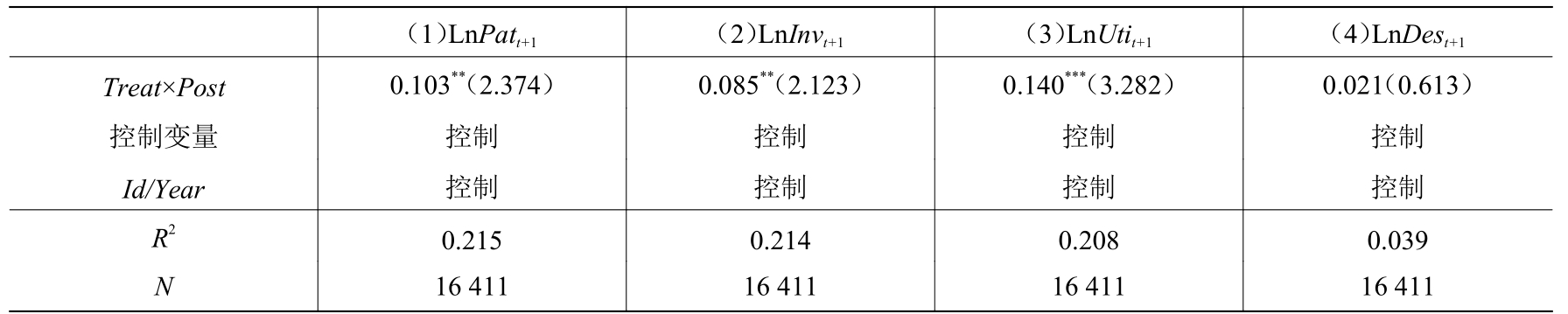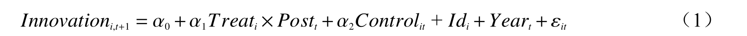 其中,被解释变量Innovationi,t+1表示第i 个企业在第(t+1)年的创新产出水平,即各类专利申请量加1 之和的自然对数,包括全部类型的专利申请总量(LnPati,t+1)、发明专利申请量(LnInvi,t+1)、实用新型专利申请量(LnUtii,t+1)和外观设计型专利申请量(LnDesi,t+1)。Treati表示企业i 是否对外提供担保的哑变量。本文参照姜军等(2017)的做法并进行适当调整,计算每家企业在《通知》实施当年(2014 年)是否对外提供担保,若提供对外担保,则Treati取值为1,即为处理组;否则取值为0,即为控制组。Postt代表担保圈风险防范法规事件冲击的时间维度哑变量,鉴于该《通知》于2014 年7 月开始实施,真正对微观企业全年的生产经营活动产生影响是从2015 年开始的,故本文将年份在2015 年及其之后的研究样本的时间虚拟变量Postt设定为1(实验组),否则为0(对照组)。Treati×Postt是核心解释变量,即企业对外是否提供担保的虚拟变量与担保圈法规实施前后的时间虚拟变量的乘积,它的系数反映了与控制组企业相比,处理组中企业技术创新在关联担保风险管控法规实施后发生的变化程度,即法规实施的效果。Controlit表示控制变量,Idi代表企业个体固定效应,Yeart代表年份固定效应,εit则代表扰动项。