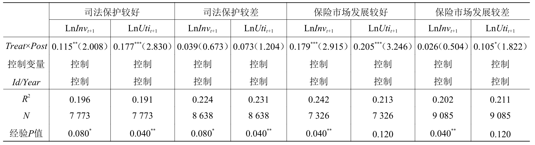 由表3 的结果可知,在保险市场发展较好的地区,担保圈法规对发明专利创新的促进作用显著为正,且组间差异系数的经验P 值为0.040,在5%水平上显著。而在该法规对实用新型专利申请量的影响中,组间系数差异检验并不显著。这说明相对于非发明专利而言,发明专利研发复杂程度更高,周期更长,所需投入的资金也更多,一旦研发失败或成果市场化程度很低,就意味着企业的损失会较大。担保圈法规虽然起到了事前防范债务违约风险的作用,但发明专利研发失败所带来的财产损失更需要保险市场的“事后救济”来加以补偿,这样才能真正解除企业开展核心技术创新的后顾之忧。假说3 得以验证。