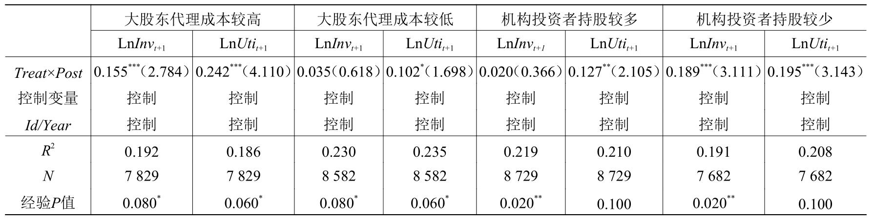 1.基于大股东代理成本和机构投资者持股的分样本检验。大股东可能趁着关联担保借助应收、预付账款等,推迟清偿上市公司的款项,从而带来债务违约风险。本文借鉴陈泽艺等(2022)的方法,使用其他应收款净额除以营业收入来衡量大股东代理成本。将大股东代理成本大于年度-样本企业中位数的作为大股东代理成本较高组,否则为大股东代理成本较低组,以检验这两组样本中,关联担保风险管控法规对担保企业创新的影响差异。表2 显示,在大股东代理成本较高组中,关联担保风险管控能够降低对外担保的负面效应,提高企业的创新能力;而在大股东代理成本较低组中,这种效应并不明显,且对发明专利和实用新型专利影响的组间系数差异的经验P 值分别为0.080 和0.60,在10%水平上通过了显著性检验。因此,研究假说2 得到了实证检验。这可能是因为,企业债务违约风险与内部控制的缺陷高度相关,减少大股东利用关联担保对中小股东利益的侵占也是降低关联企业风险转嫁的必要举措,而担保圈法规通过对担保实施监管并进行风险预警,有助于减轻高风险担保的危害,以更好地促进企业创新。