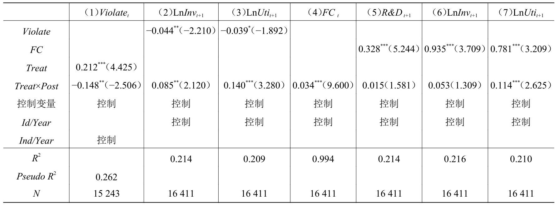 表4 列(1)的结果显示,核心解释变量(Treat×Post)对担保企业违约风险具有显著的负向影响;列(2)与列(3)的结果显示,同时引入核心解释变量(Treat×Post)和违约风险(Violate)后,违约风险对各创新变量的影响显著为负,核心解释变量对各创新变量的影响依然显著为正。这说明《通知》的实施起到了避免担保企业陷入债务违约风险,为担保企业开展创新提供稳定现金流的作用。此外,该《通知》可能通过缓解担保企业的债务风险和融资成本上升等负面效应,进而缓解融资约束。本文参照张爱美等(2019)的做法,使用SA 指数的绝对值来衡量当期企业面临的融资约束状况。该数值的绝对值(FC)越大代表融资约束程度越低。表4 列(4)的结果显示,核心解释变量(Treat×Post)对企业融资约束(FC)的影响在1%水平上显著为正;表4 列(5)-列(7)的结果显示,同时引入融资约束、关联担保与担保圈法规事件交乘项后,关联担保风险管控能够通过缓解融资约束而促进研发投入(研发投入为下一期研发费用化支出占研发总支出的比重,用R&D 表示;其中,研发总支出包括研发费用化支出和研发资本化支出)和创新产出的增加。
