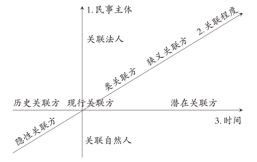 综上所述,增设多重标准界定关联方类型,使得关联方类型从民事主体、关联程度和发生时间上构成一个完整体系,具体如图1所示。
