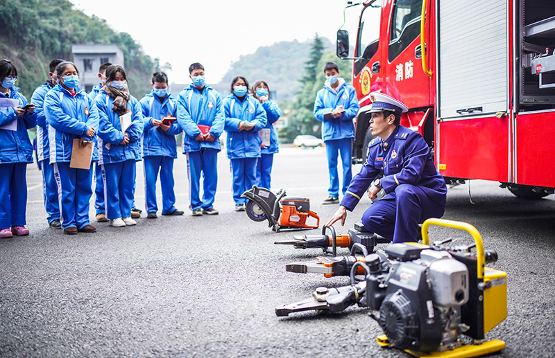 1月12日,消防员向学生们介绍破拆器械。