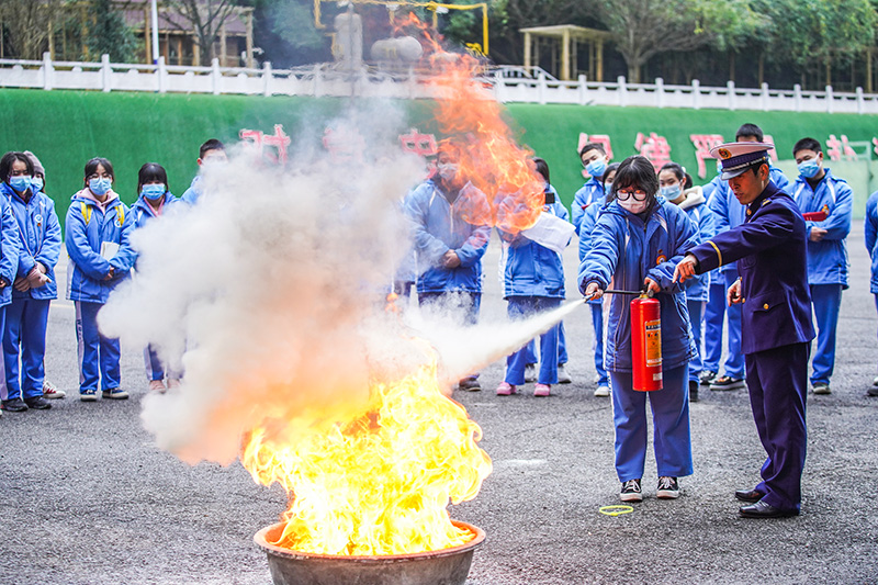 1月12日,学生在消防员的指导下使用灭火器。