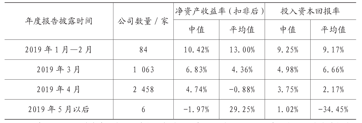 2018年度,共有3 611家上市公司披露了年度报告。将上市公司披露年报的时间及其经营业绩(扣非后净资产收益率、投入资本回报率)结合分析如表1。
