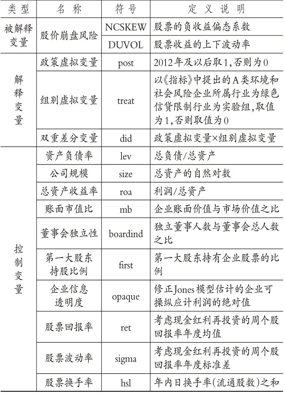 1.被解释变量。本文的核心被解释变量是股价崩盘风险(NCSKEW和DUVOL)。参考已有股价崩盘风险相关研究(易志高等,2019;曹廷求和张光利,2020;李文贵和路军,2022),本文采用公司股票的负收益偏态系数NCSKEW和股票收益的上下波动率DUVOL来衡量企业股价崩盘风险。NCSKEW取值越大,公司股票收益率偏态系数负的程度越高,公司股价崩盘风险越大;DUVOL取值越大,公司股票收益率左偏程度越高,意味着公司股价崩盘风险越大。此外,在稳健性检验中,本文以股价崩盘风险是否发生的虚拟变量CRASH来检验绿色信贷政策可能对股价崩盘风险产生的影响。