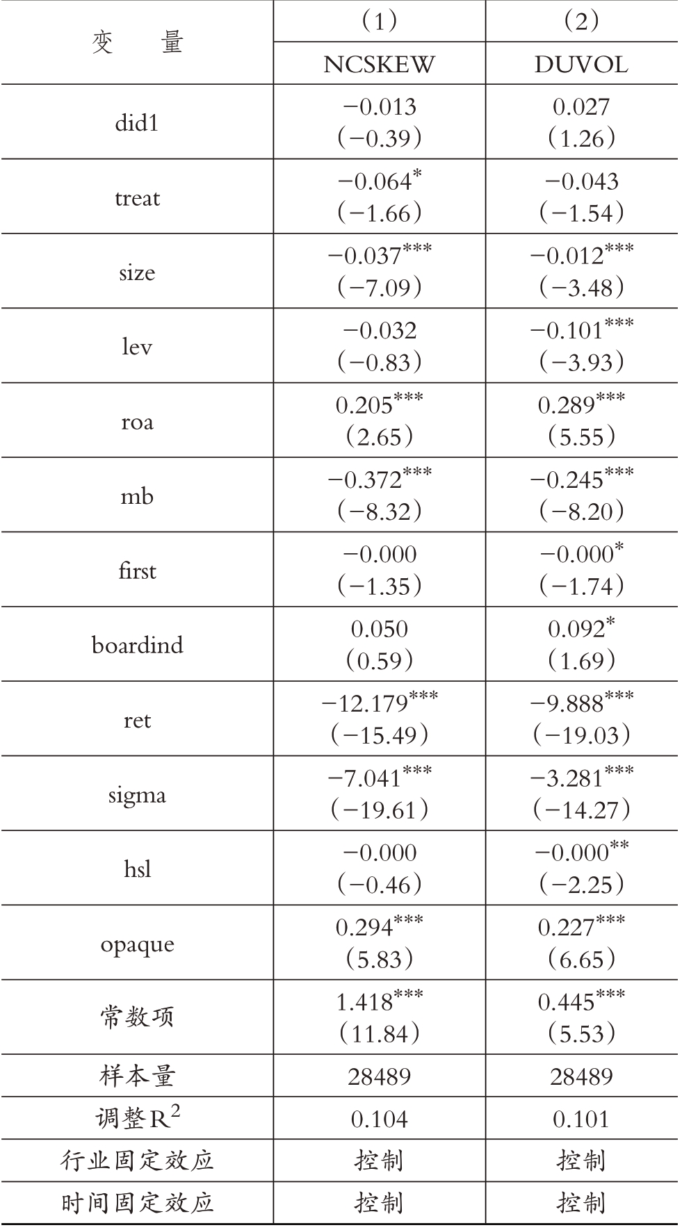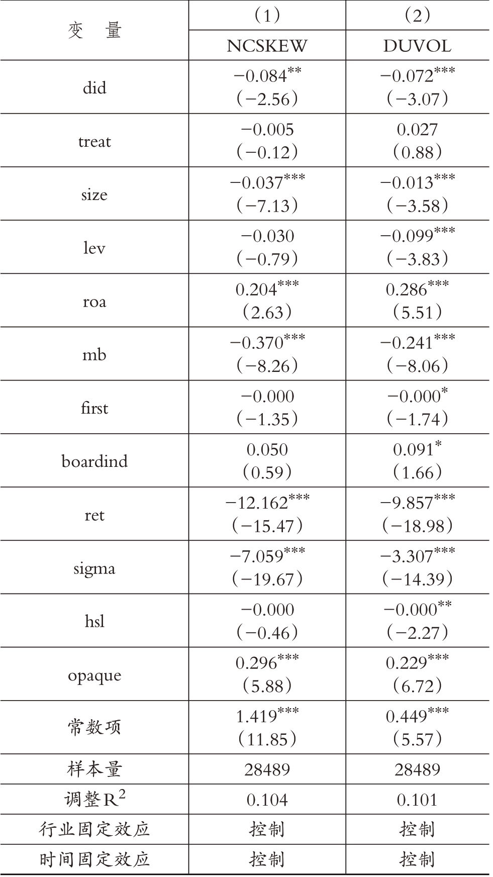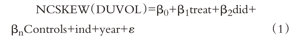 其中:treat为绿色信贷政策限制行业,若该上市公司所属行业为《指标》中规定的A类行业,则取值为1,作为实验组,其他公司则被认定为对照组,取值为0。treat×post的交互项did,该变量系数代表绿色信贷政策对于上市公司股价崩盘风险的政策影响。如果β2显著小于0,则表明绿色信贷政策能够降低上市公司股价崩盘风险。Controls包含上文选取的所有控制变量。ind为行业固定效应,year为时间固定效应。本文所有实证检验结果均在公司个体层面上对标准误进行聚类调整。