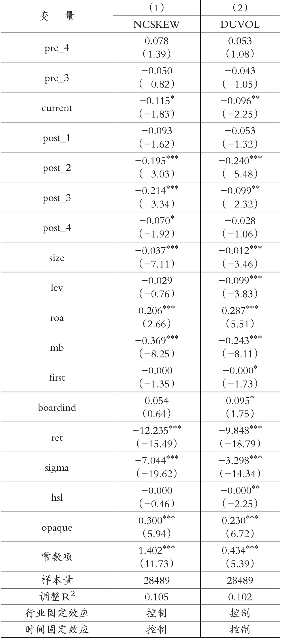 表2为描述性统计结果。从股价崩盘风险指标NCSKEW、DUVOL的标准差与最大最小值来看,不同公司之间的股价崩盘风险存在较大差异。treat变量的均值为0.066,表明我国上市公司中受到绿色信贷政策影响的占比大约为6%~7%。由于本文以《指引》发布的2012年作为绿色信贷政策的实施年份,因此样本期内(2008~2020年)77.8%的样本处于政策实施后的年份。本文样本公司的资产负债率均值为44.7%,总资产收益率均值为3.8%,独董平均占董事会总人数的37.4%,第一大股东平均持股超过三分之一,其他相关变量的取值也均在合理范围之内。