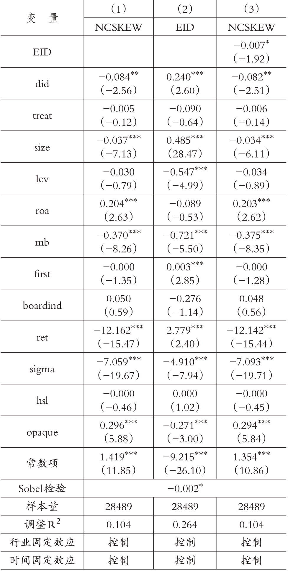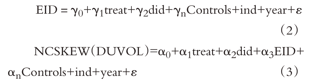 EID为上市公司环境信息披露的衡量指标。参照许林等(2021)的研究,从环保理念、环保目标、环保管理制度体系等几个细分维度来度量上市公司的环境信息披露水平,并在此基础上增加了环保教育与培训、环保专项行动以及环境事件应急机制三个维度,并从上述六个维度来对上市公司环境信息披露水平进行衡量。具体来看,依照上述六个维度分别设置六个哑变量,若该上市公司披露了相关内容,则赋值为1,否则为0;最终,该公司的环境信息披露水平为上述六个维度的哑变量取值之和。其他变量定义见表1。依据模型(2),对中介变量(EID)进行回归,若系数γ2显著,则依据模型(3)同时纳入自变量did与中介变量EID进行分析。若模型(3)中系数α3显著且α2不显著,则为完全中介效应;但若系数α3和系数α2均显著,则为部分中介效应;若系数α3不显著,则中介效应不成立。